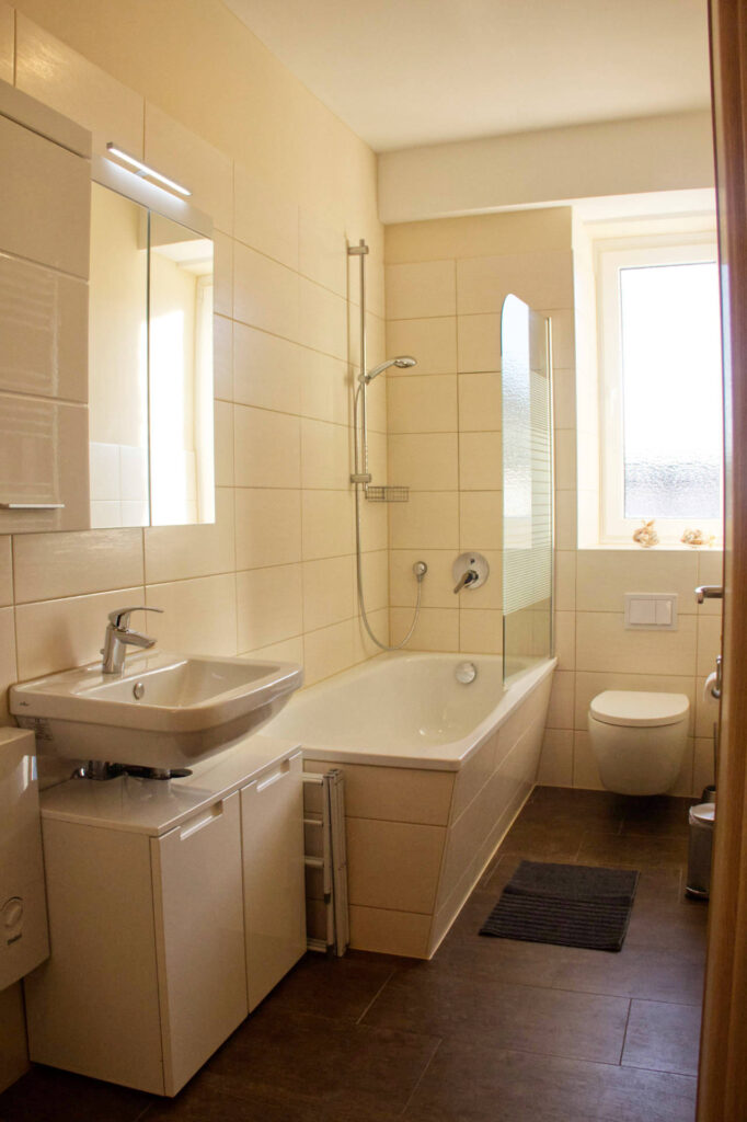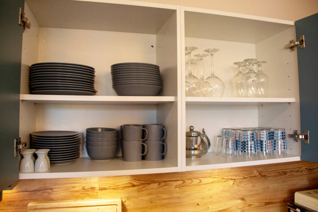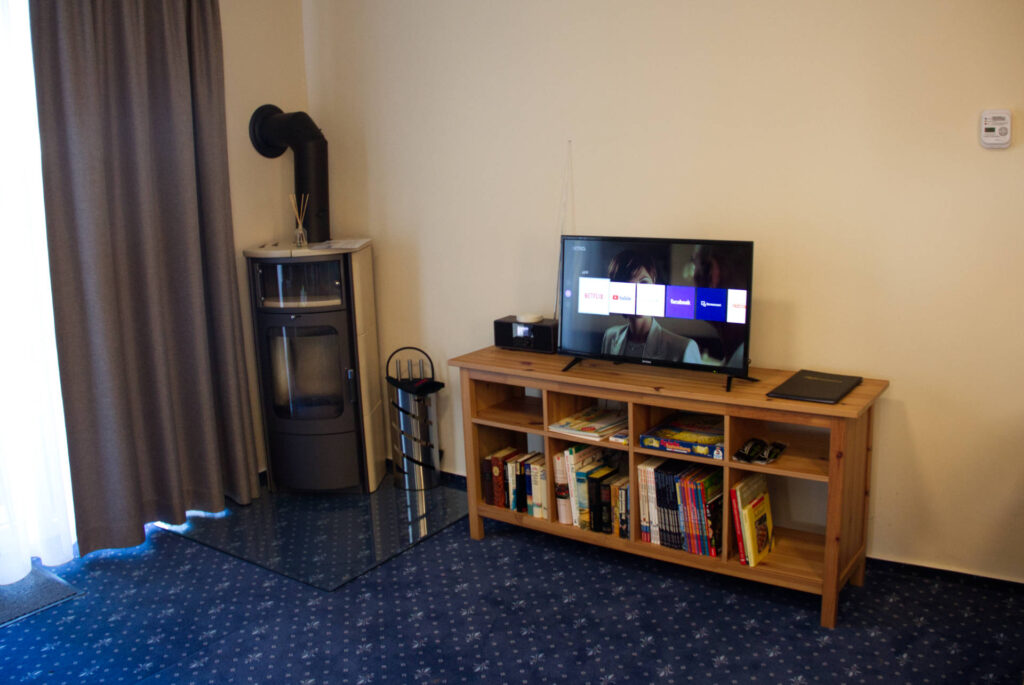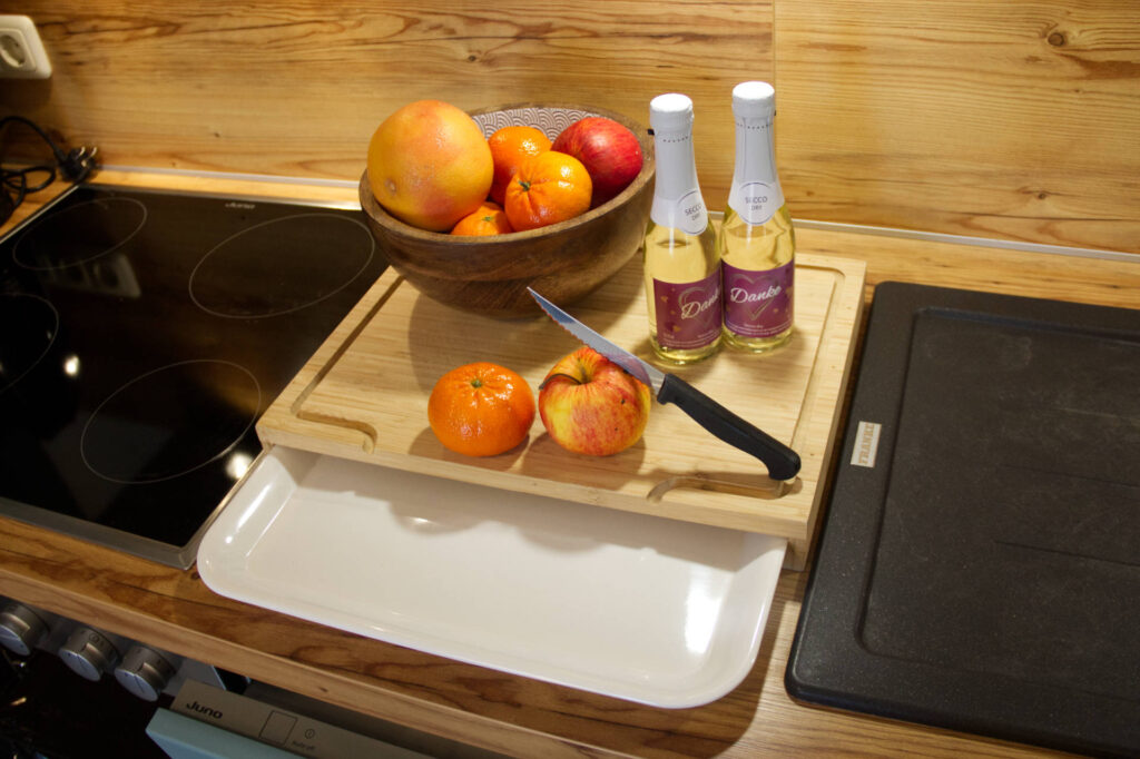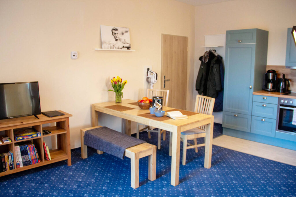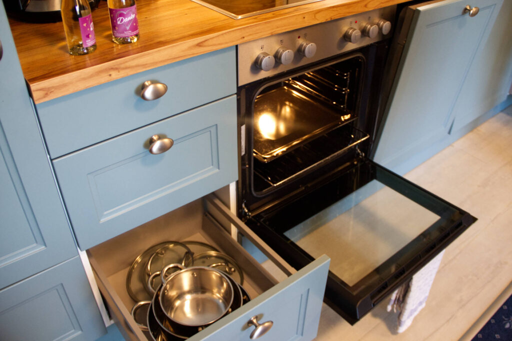 In der modernen Einbauküche mit großer Essecke finden Sie alles, was Sie für Ihre Selbstverpflegung benötigen. Zur Ausstattung gehören ein Kühlschrank, Geschirrspüler, Elektroherd mit Backofen, Mikrowelle, Wasserkocher und Kaffeemaschine.