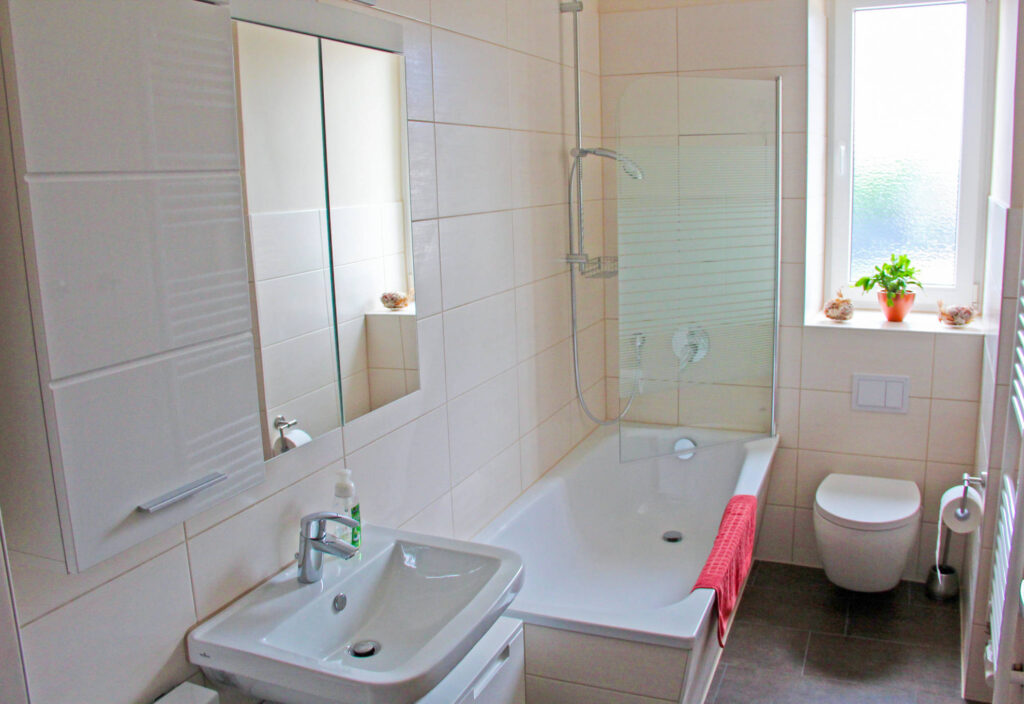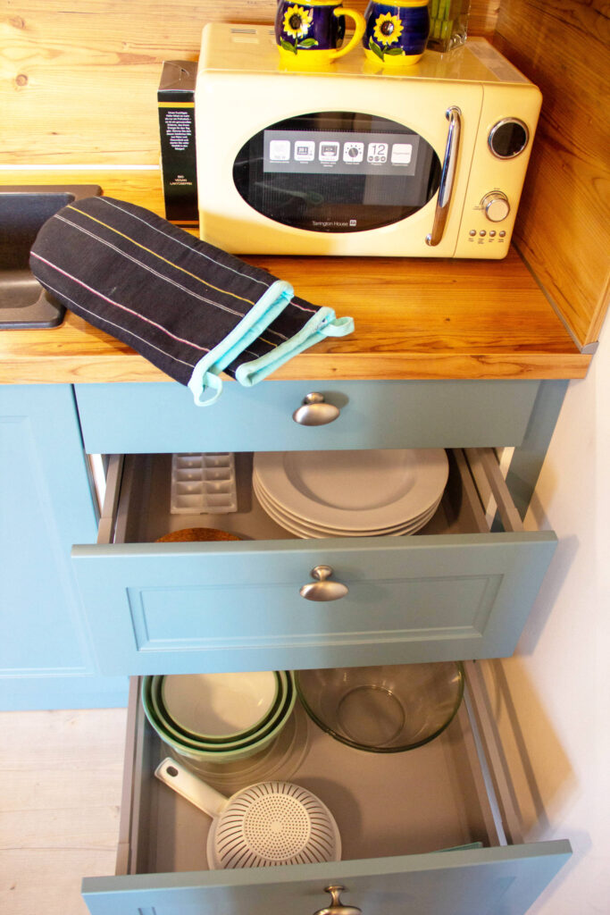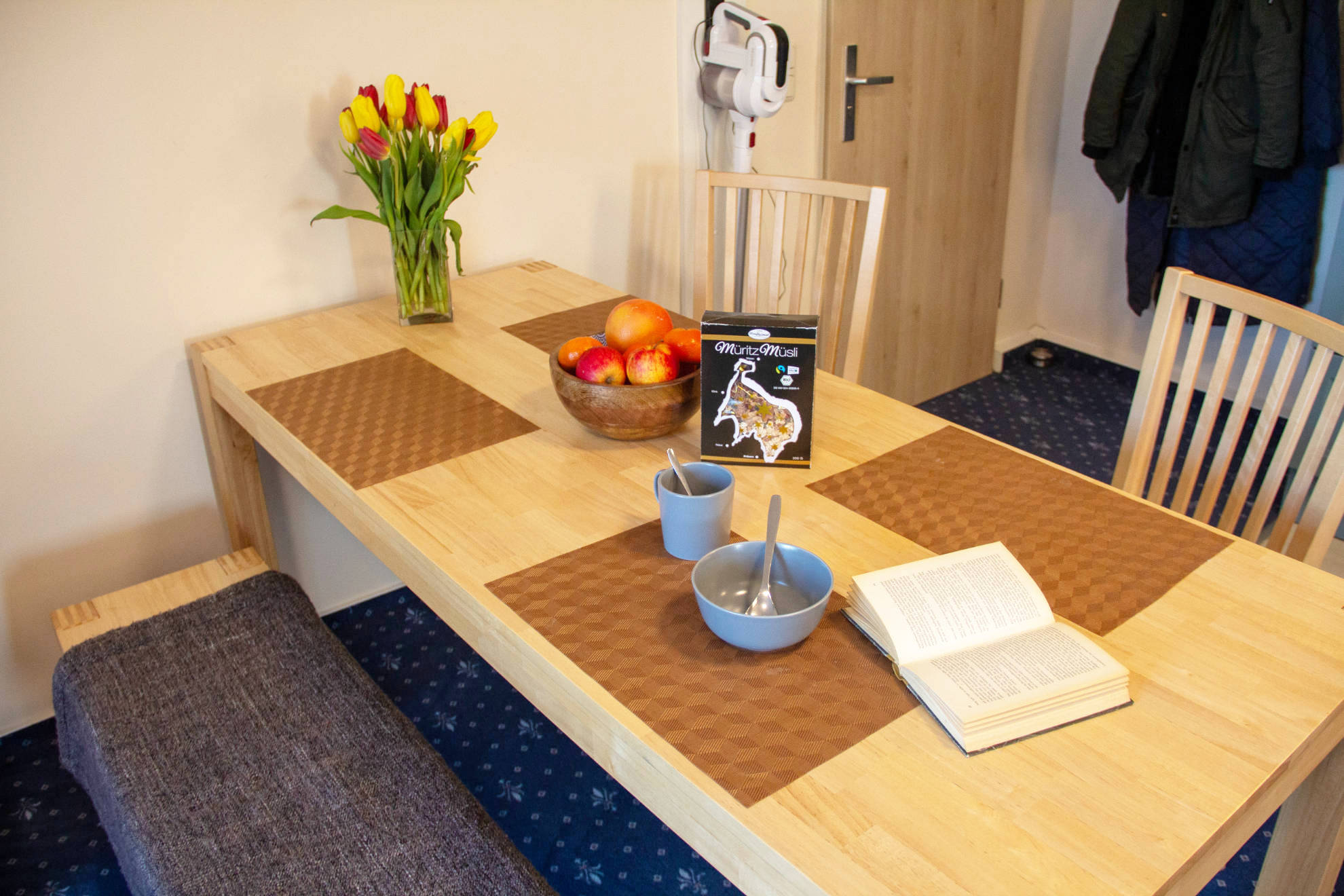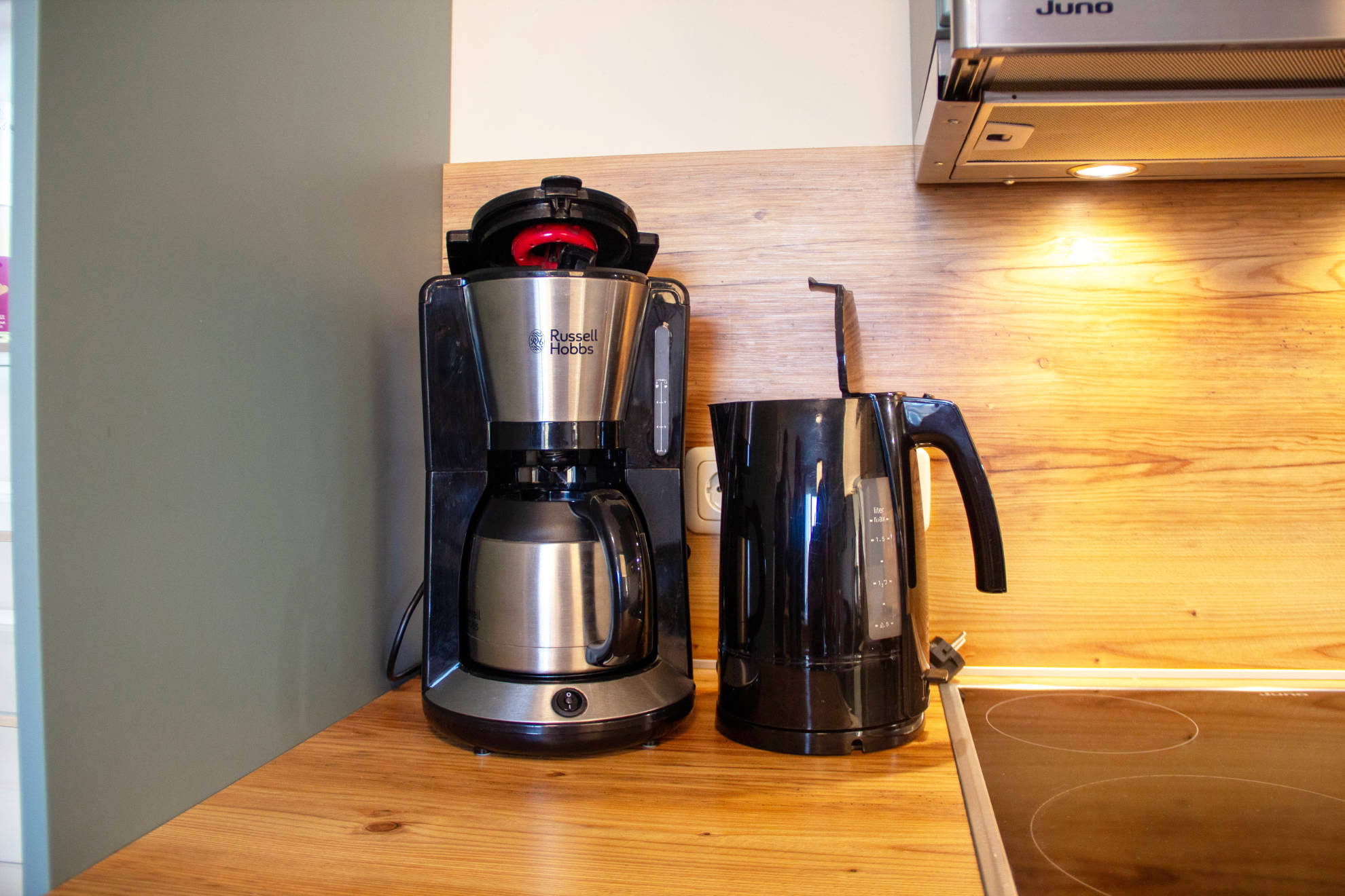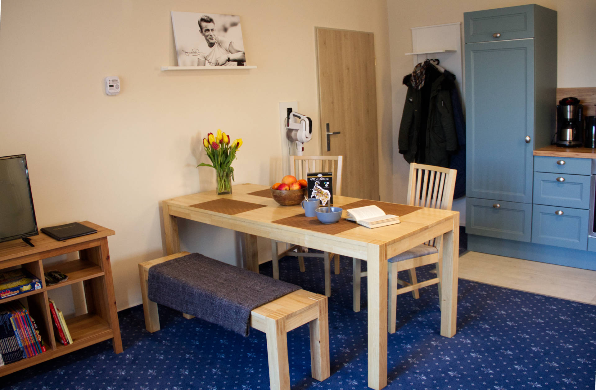 In der modernen Einbauküche mit großer Essecke finden Sie alles, was Sie für Ihre Selbstverpflegung benötigen. Zur Ausstattung gehören ein Kühlschrank, Geschirrspüler, Elektroherd mit Backofen, Mikrowelle, Wasserkocher und Kaffeemaschine.